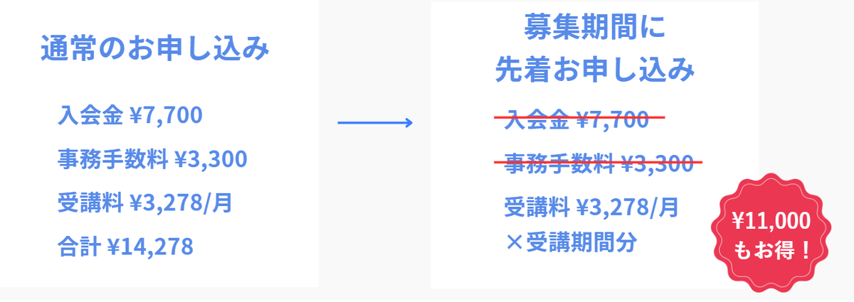 先着予約お申し込み特典として入会金、事務手数料割引料金にてご受講いただけます。