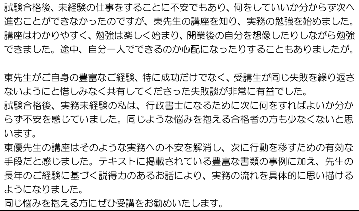 何よりも、東先生の行政書士として相続実務の真の専門家を養成するという真摯な気持ちが伝わってくる、大変、素晴らしい研修講座であったと思います。本当にありがとうございました。
